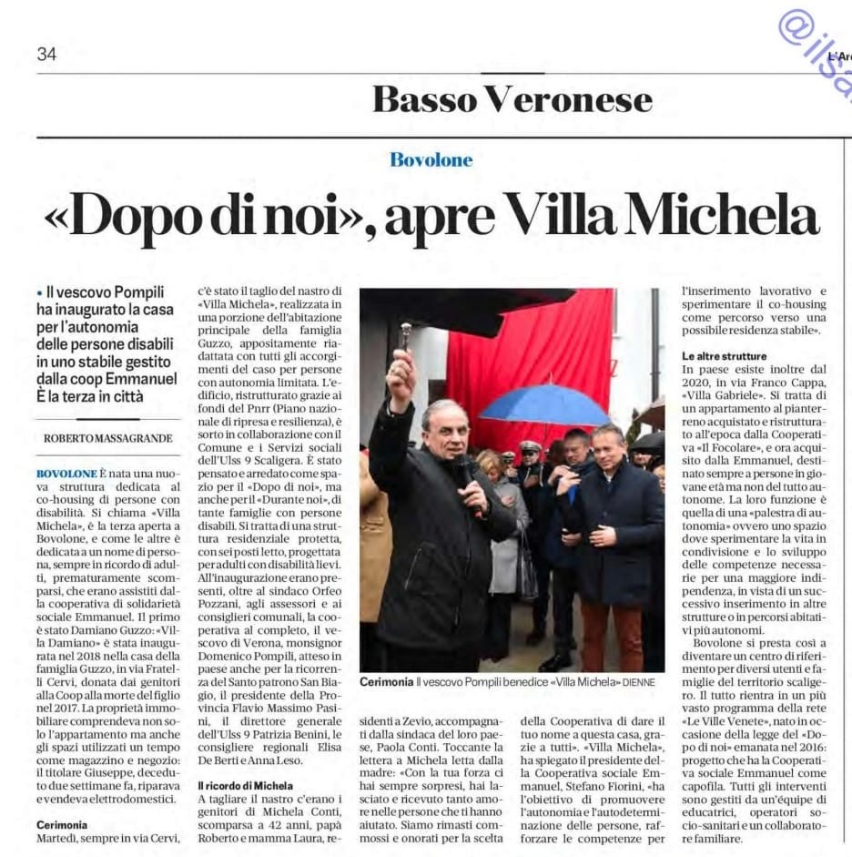 L’obiettivo di Villa Michela è quello di avviare persone con disabilità a lievi percorsi di autonomia, crescita personale, lavorativa e relazionale in un nuovo spazio a Bovolone. La nuova struttura residenziale è destinata a ospitare sei giovani disabili, inaugurata dalla Cooperativa Sociale Emmanuel alla presenza del presidente Stefano Fiorini e degli operatori della Cooperativa, del Vescovo di Verona Mons. Domenico Pompili che ha benedetto la casa, del sindaco di Bovolone Orfeo Pozzani e di sindaci dei territori vicini, del consigliere regionale delegato alle infrastrutture Elisa De Berti, del consigliere regionale Anna Leso, del presidente della Provincia di Verona Flavio Massimo Pasini e della Dott.ssa Patrizia Benini direttore generale dell’Azienda ULSS 9 Scaligera oltre che di volontari della Cooperativa e di cittadini.